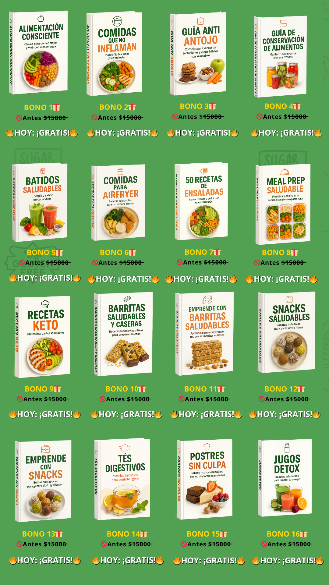 Los 25 bonos son INCREÍBLES! Tengo recetas para años. La mejor inversión que hice en mi salud. Gracias!